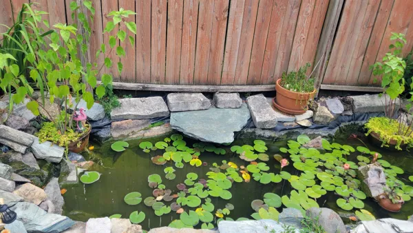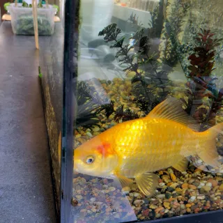 Beloved greenhouse goldfish mascot moves from a 15 gallon tank to a backyard pond
